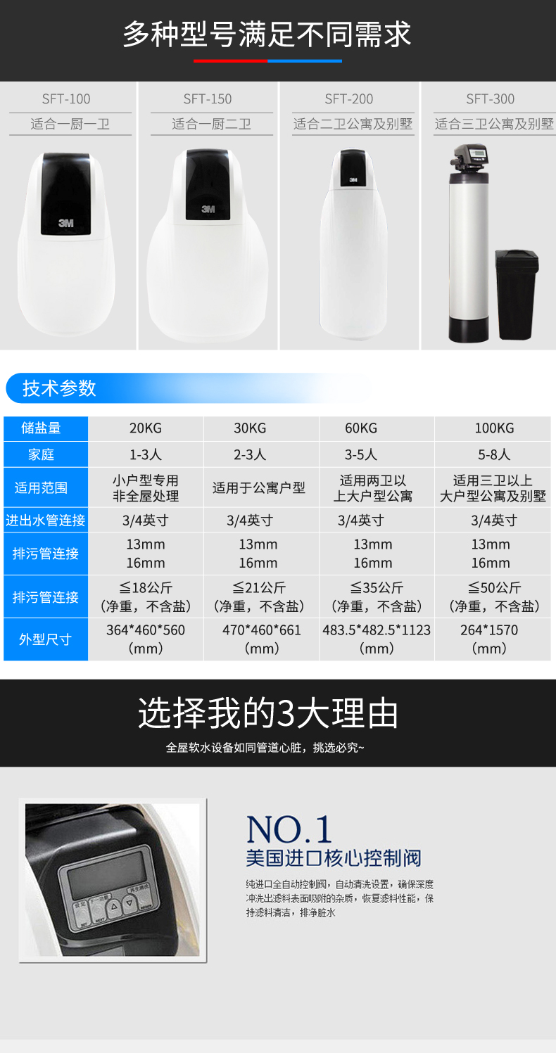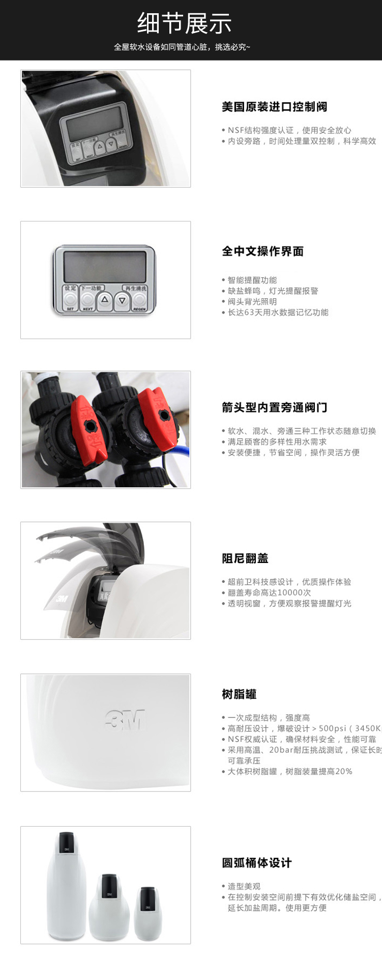 ●美國原裝控制閥門,智能提醒功能,長時間運行可靠,免維護,全中文操作界面更方便,缺鹽蜂鳴,燈光提醒報警