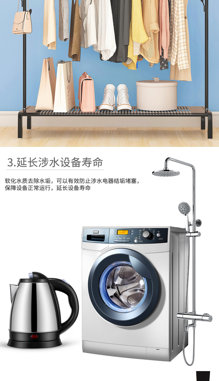 ●圓弧桶體設計,外形美觀,在控制安裝空間前提下,有效優化儲鹽空間,延長加鹽周期,使用更方便
